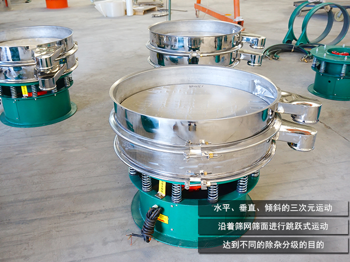 橡膠粉一般分為粗膠粉0.425mm(40目)以上、細(xì)膠粉0.425mm—0.180(40—80目)、微細(xì)膠粉0.180—0.075mm(80—200目)。DH系列旋振篩通過(guò)立式振動(dòng)電機(jī)作為振動(dòng)源,在篩分過(guò)程中將電機(jī)的旋轉(zhuǎn)運(yùn)動(dòng)轉(zhuǎn)變?yōu)樗?、垂直、傾斜的三次元運(yùn)動(dòng),再把這個(gè)運(yùn)動(dòng)傳遞給上端的篩面進(jìn)行橡膠粉篩分。將篩分的橡膠粉沿著篩網(wǎng)篩面進(jìn)行跳躍式運(yùn)動(dòng),再通過(guò)篩面上不同尺寸大小的網(wǎng)孔分級(jí)過(guò)網(wǎng),以達(dá)到不同的除雜分級(jí)的目的。篩網(wǎng)層數(shù)高可達(dá)到5層,可滿(mǎn)足不同規(guī)格的分級(jí)除雜。
